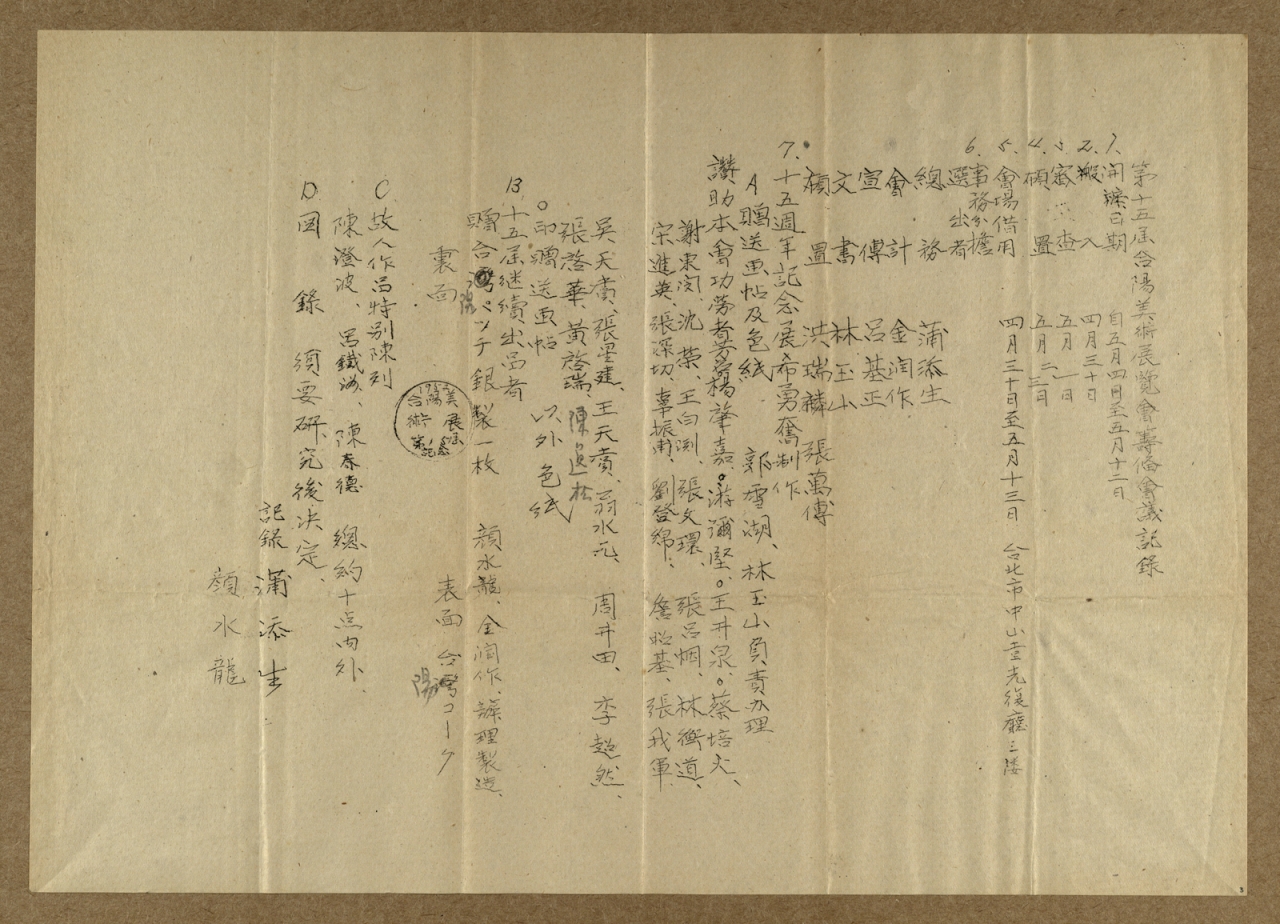 臺陽展自1945年因時局動盪停辦三年,在1948年恢復辦展迄今;同年,第11屆展覽假臺北市中山堂舉辦「光復紀念展覽會」。 展覽的作品部別在戰後也有所擴增,自戰前的西洋畫(起初)、東洋畫(1940年)、雕塑(1941年),戰後增設版畫(1975年)、水彩(2001年),至今涵蓋油畫、膠彩、墨彩、水彩、版畫、雕塑等六類。本子題精選館藏的戰後展件,補充臺陽展復展後的週年脈絡。 一、第15屆臺陽展籌備會議記錄 此件為籌備第15屆臺陽展(1952年)的會議記錄,含辦展期程、會場(中山堂光復廳)、展務分工等。為紀念展覽舉辦15週年,提出4點預計項目: