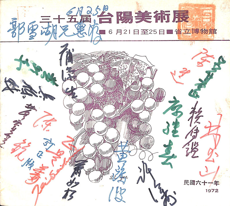 五、第35屆臺陽展目錄及會場外觀 第35屆臺陽展(1972年)於省立博物館(今國立臺灣博物館)舉行,當年適逢會員顏水龍70大壽,特請他設計目錄封面,以35顆紫葡萄代表35年來展覽的豐碩成果。 此件臺陽展目錄為郭雪湖收藏,封面有多位藝術家簽名,如陳進、呂基正、林玉山、蒲添生等。 ![]() 圖38 第35屆臺陽展目錄,1972年