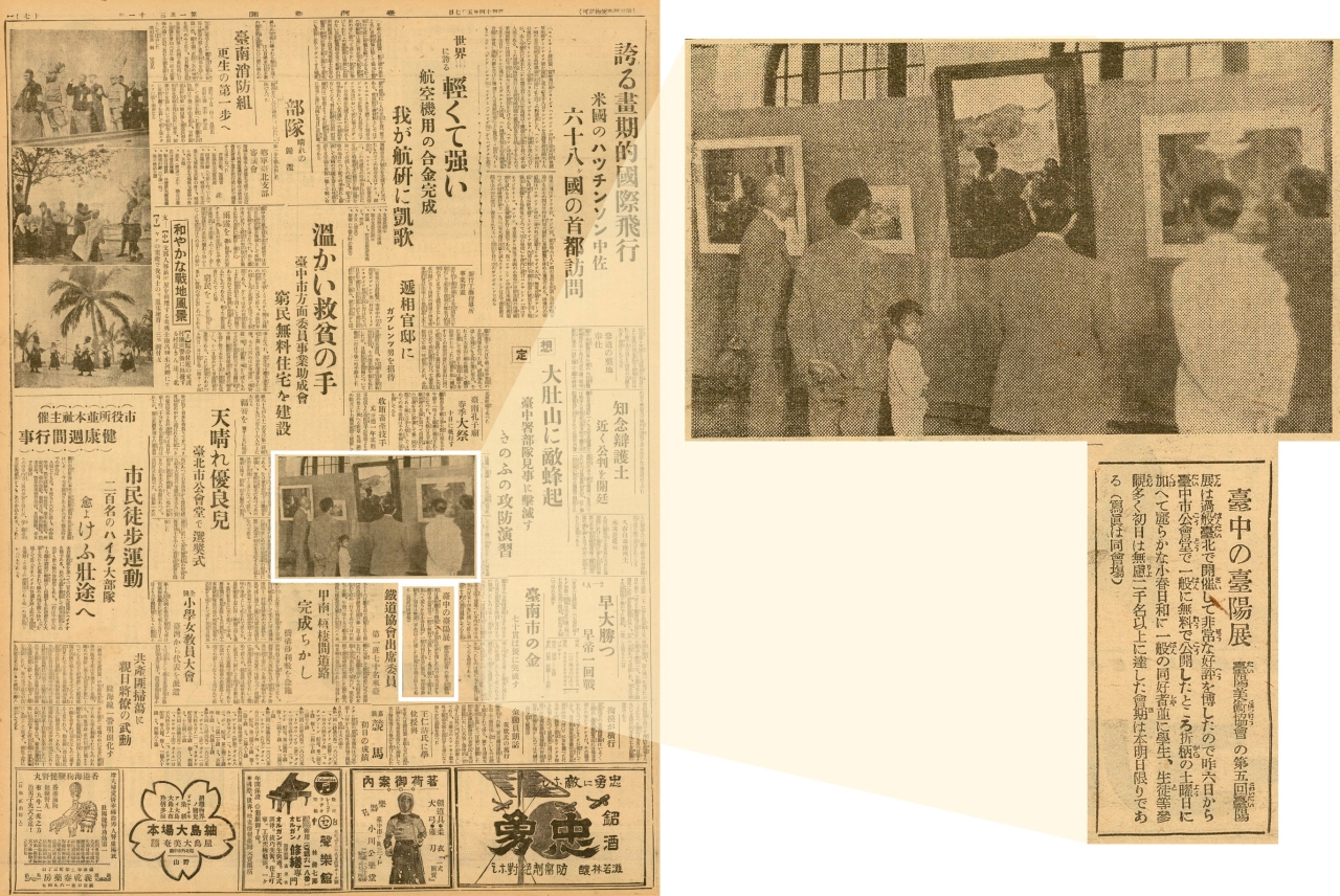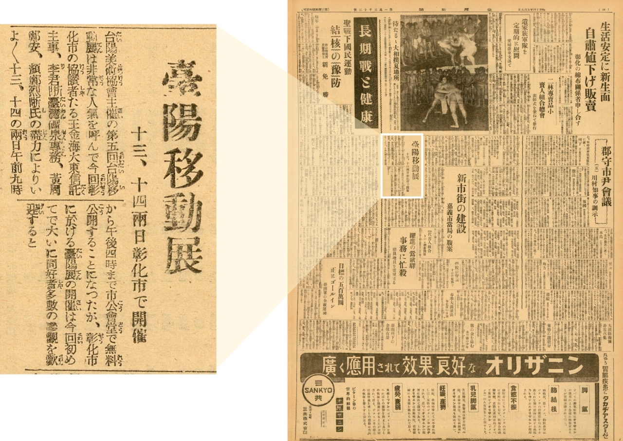 日治時期唯一由臺人創辦的報紙《臺灣新民報》,於1932年開始發行日刊,其中本館獨家典藏的1938至1944年,適逢臺陽展第4至第10回,能從中發掘相關報導百餘則。而另一份日治時期三大御用報之一的《臺灣新聞》,前身為《臺中每日新聞》、《中部臺灣日報》,是中部代表報刊;其中獨家館藏的1938至1944年,包含數十則臺陽展相關報導,尤其可見中南部移動展的展訊。然而,隨著戰況惡化與資源不足,1944年4月,這兩家報紙與其他四家合併為《臺灣新報》。