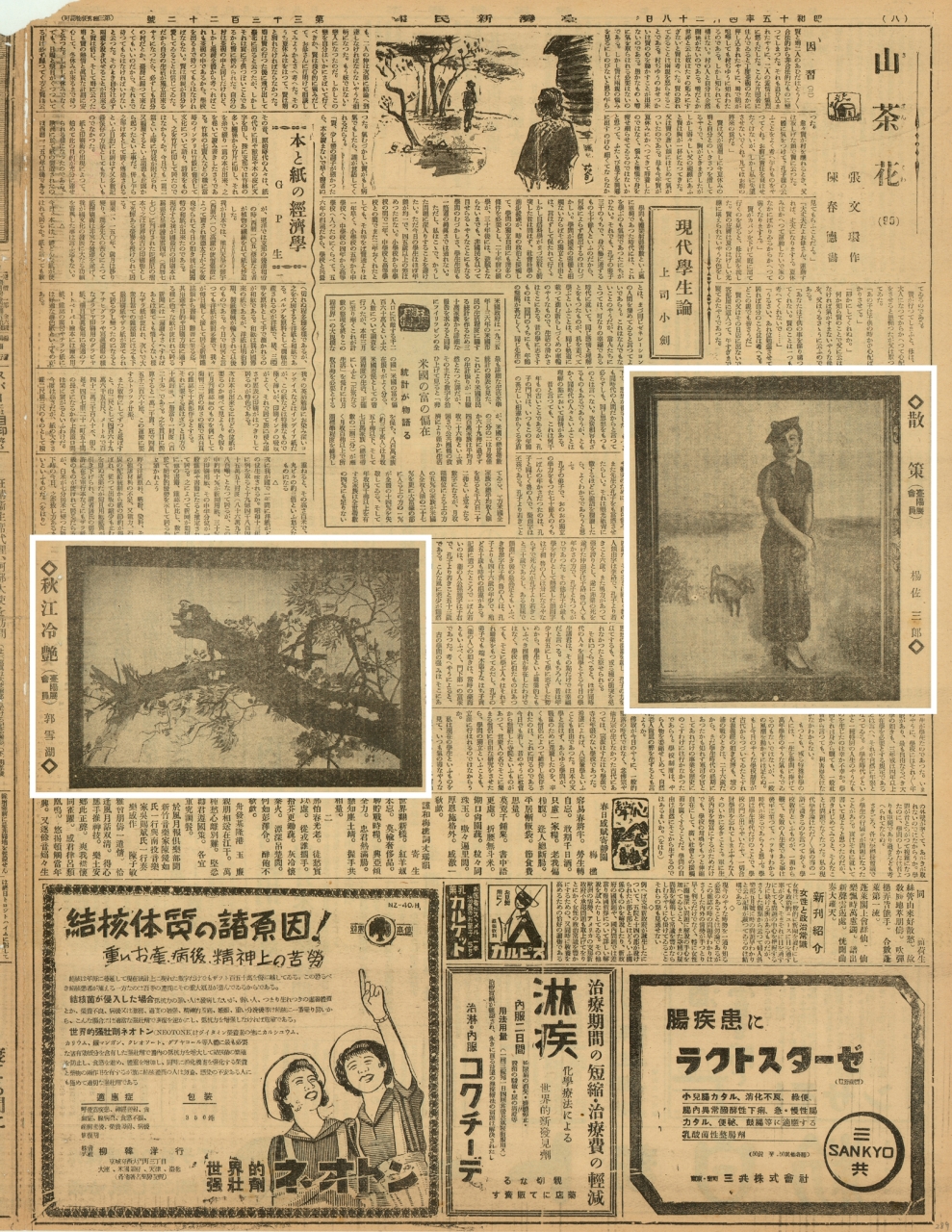 圖16 郭雪湖〈秋江冷艷〉、楊佐三郎〈散策〉入選臺陽展報導,1940年