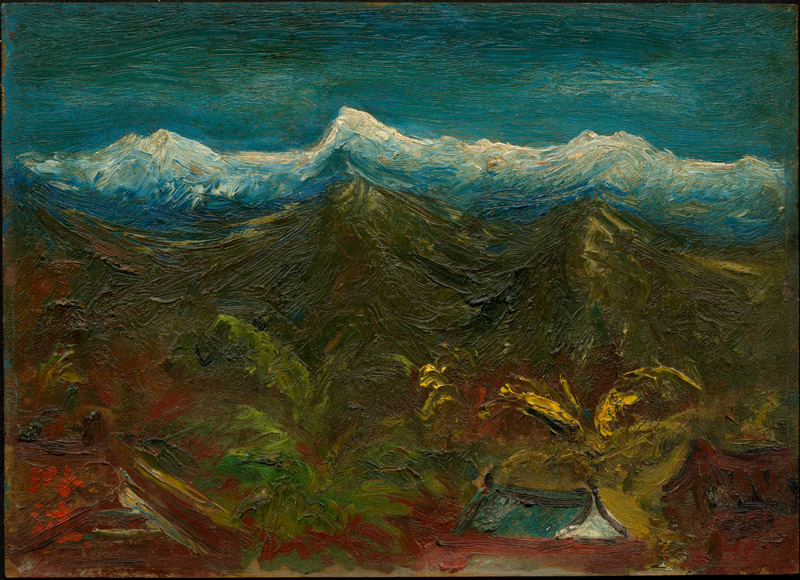 此作入選第7回臺陽展(1941年),近景描繪幾間燕尾脊與馬背脊建築,遠景為連綿的玉山山脈(新高山)。