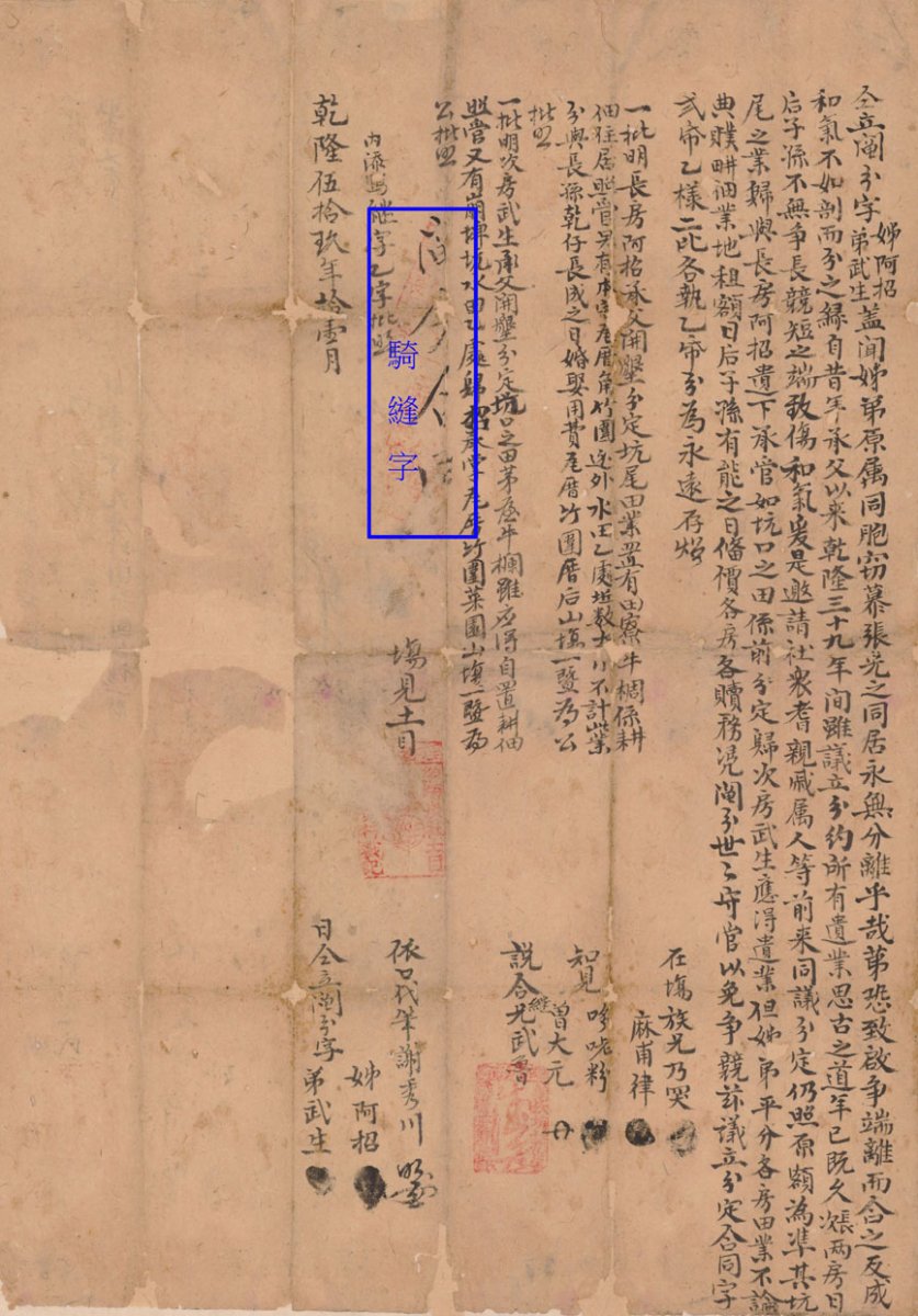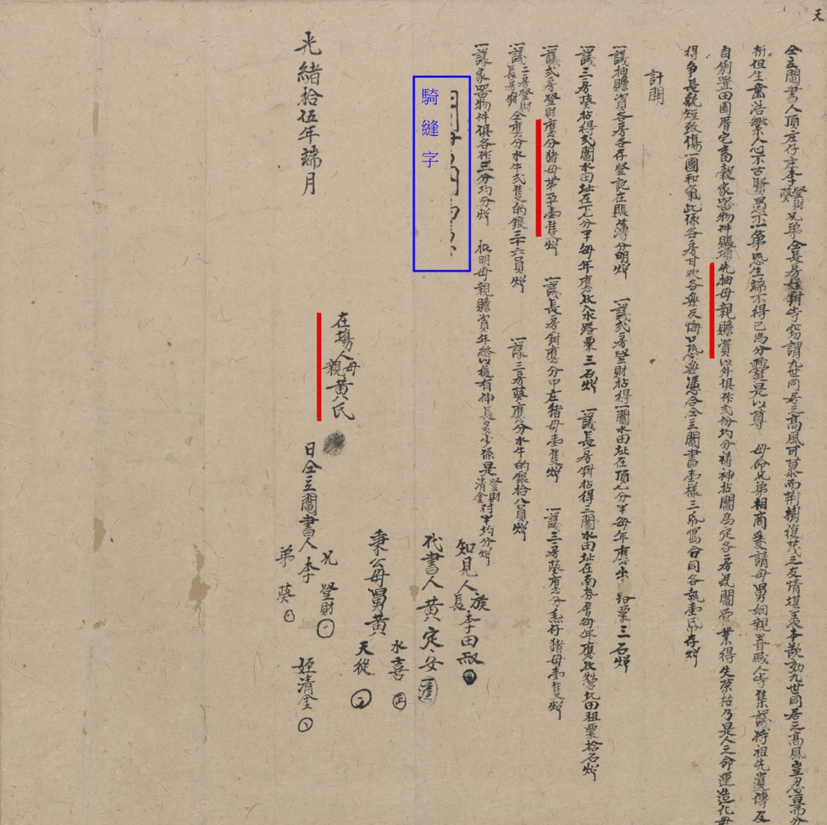 撰文/臺史所檔案館館員 歐怡涵 ● 圖/臺史所檔案館 鬮書是指關於分家、分財的文書契據。一般傳統家庭,每當家長年老或亡故時,便會邀請相關親族,依據諸子均產原則,分配家產與田產;為求公平起見,採取作鬮分產的方式,抽取應分得的財產,訂立鬮書以為析產憑藉。鬮書中的女性,包含了繼承者、訂約者等,展現的是已婚女性在家庭生活中的角色與生時的財產繼承權。此外,除了平埔族的契字,女性在鬮書中往往只聞其姓,卻不知其名。 圖1:1889年頂莊仔莊李登財等仝立鬮書。(檔案來源:臺中大甲、臺中市、彰化及臺南佳里興地區土地文書,中研院臺史所檔案館數位典藏)圖2為乾隆59年(1794)11月,北部南崁社的平埔族姊弟阿招與武生為分配家族財產立下的合約。契字中明白寫出長房為阿招(姊)、次房為武生(弟),這或許是因代筆人為漢人,而帶入漢人「房」的書寫方式,並將女性列為長房。漢人社會中,僅男性成員得於家族中列為「房」的繼承結構。在此契書所顯示出的平埔社會,女性亦可列為家族的一房,與男性成員相同,作為財產的繼承者。 圖2:1794年姊阿招、弟武生仝立鬮分字。(檔案來源:臺北地區與金包裡社土地文書,中研院臺史所檔案館數位典藏)圖3為咸豐11年(1861)8月母劉傅氏立撥定鬮書字。約中也未見父親的身影,故女性在此處作為訂約者,在家中無男性尊長時,成年婦女需代為治家,作為尊長立約。約中載明,母親劉傅氏可分得水田一份,任由她管耕收租,生時作為供養飲食之資,在她百年之後則作為殯葬的費用。由於鬮書是繼承權的憑證,故對於所分物業的地理範圍或數量需載明清楚,往後若遇物業移轉或買賣,便以此為憑或作補充說明。如約中在光緒癸巳年(1893)8月便補充說明鬮書內原載下新莊的厝地菜園歸劉復盛母子掌管。 圖3:1861年母劉傅氏立撥定鬮書字。(檔案來源:臺中東勢石角吳家文書,中研院臺史所檔案館數位典藏)在以上的鬮書中,會以騎縫字確定鬮書的紙數,以避免偽造,騎縫字出現的部分則會依照鬮分的人數顯現1/2、1/3、1/4……,如圖3的1/3騎縫字為「鬮書參紙各執壹紙」。這些有姓無名的成年婦女,在以男性為主要訂約者的鬮書中,除了作為在場人,在場證明契約的成立外。部分平埔族社會的女性可以承繼財產,傳統漢人女性在分家的過程中,則是作為被奉養者領取養贍之資。女性要作為訂約者,唯有在家族中缺乏男性尊長時,在男性族親的見證與一團和氣的期待下,作為家長主持分家與訂約,發揮較為主動的角色。 |